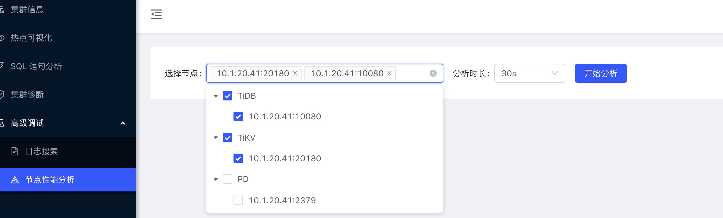 选择一个或多个需要进行性能分析的节点,并选择性能分析时长(默认为 30 秒,最多 120 秒),点击「开始分析」,即可开始性能分析。